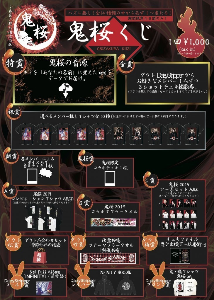 ハズレ無し!全14種類の中から必ず一つ当たる! 8月9〜10日アウトストア限定!鬼桜くじ 1回1,000円 ・商品は特賞以外はその日にお渡ししますので必ずお受け取りください。 ・お一人様一度に五回までとなりますが、再度並び直していただければご利用いただけます