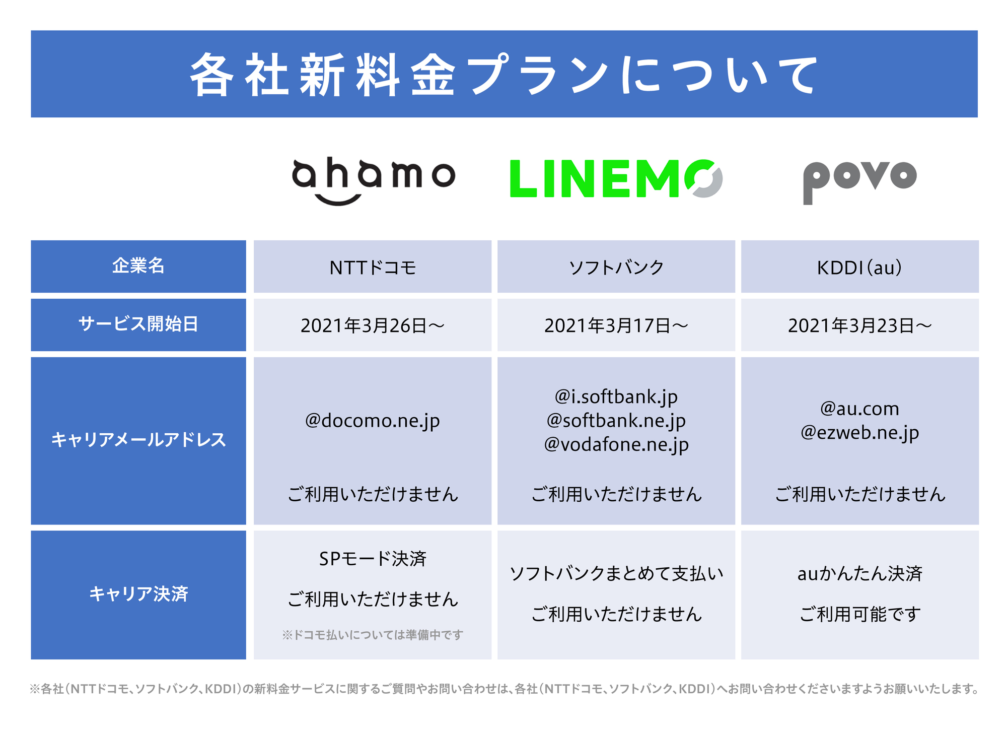 2021年3月より3大キャリアの新プラン「ahamo」「LINEMO」「povo」のサービスが開始致します。