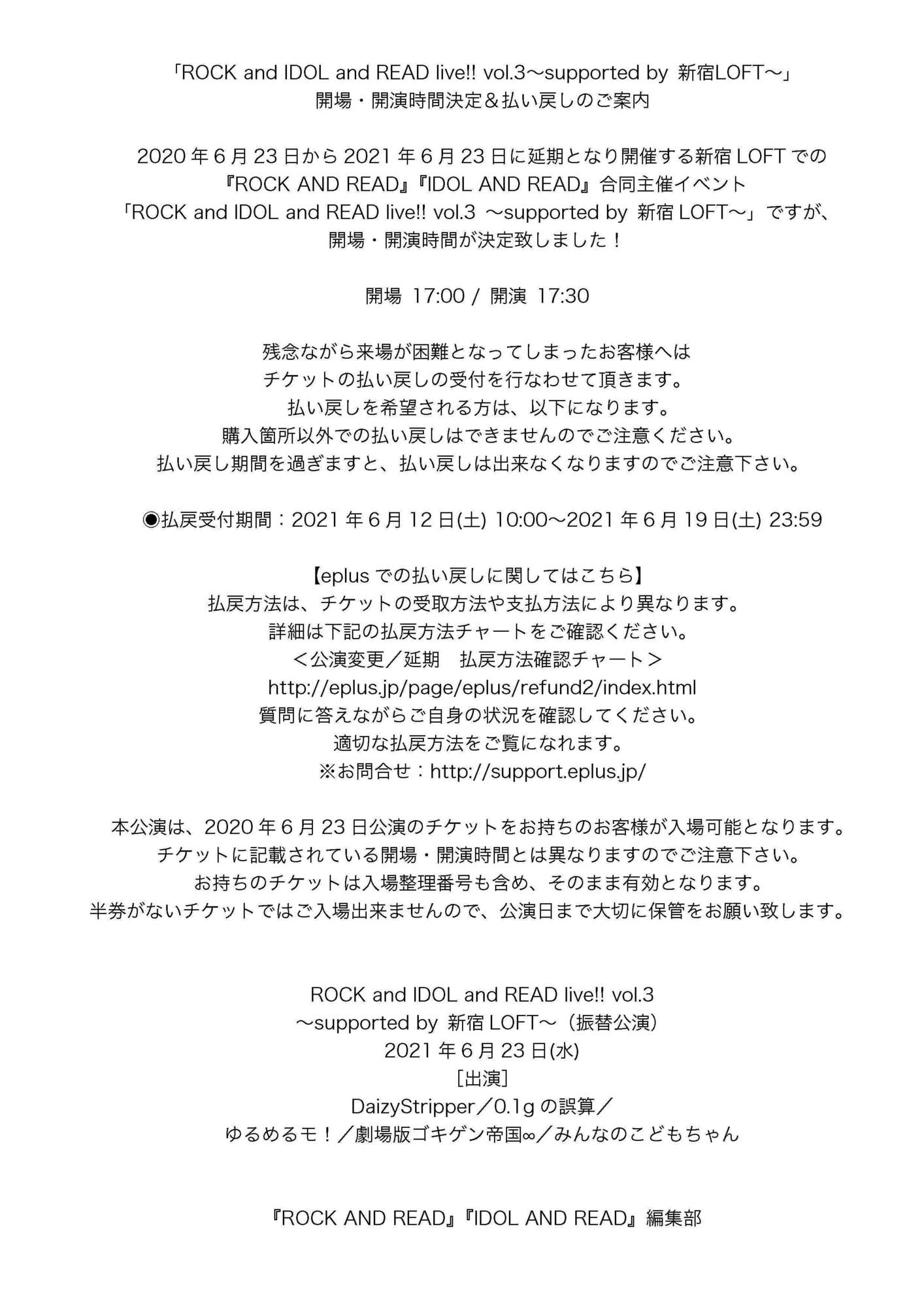 「ROCK and IDOL and READ live!! vol.3~supported by 新宿LOFT~」開場、開演時間決定&払い戻しのご案内
