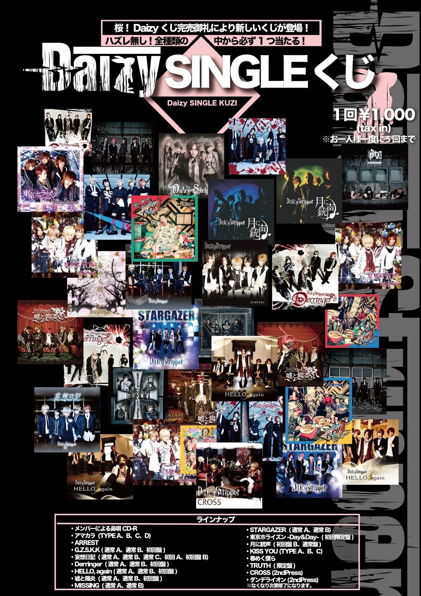 12/18柏公演より桜!Daizyくじ完売につき新しくDaizy SINGLEくじを開催致します。 ・各ライブ会場物販席にてお求めいただけます。 ・ダウトvs DaizyStripper coupling tour 2021 「鬼桜~再炎ノ契ハ酒池肉林~」 終演後3ショット撮影会の対象になります。 ・その他アイテムも通常通りお買い求めいただけます。