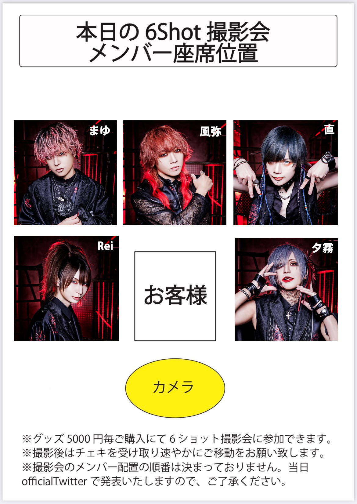・撮影は「6ショット」のみとさせていただきます。メンバーのみ、もしくは6名を超える人数での撮影は行えません。