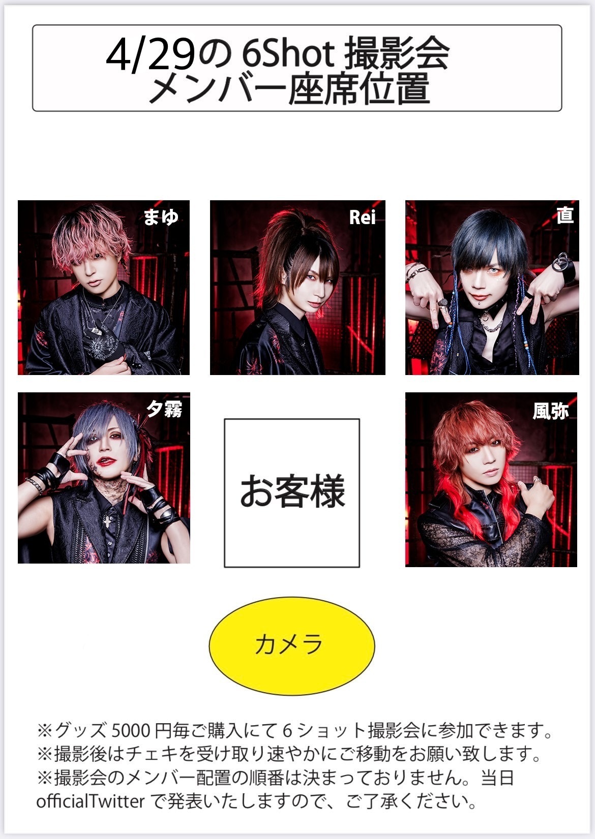 ・物販5,000円分お買い上げで終演後6ショットチェキ撮影会に参加頂けます。